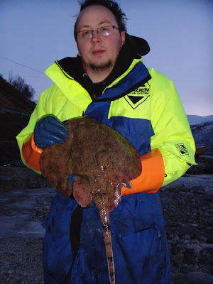 Dette ble så inspirerende for både meg og Kim at vi bare måtte ta turen utover for å prøve vi også. Planene for plassvalg ble lagt kvelden før og tidlig en lørdagsmorgen gikk vi ut i mørket. Deretter lå vi i ro i 6-7 timer... kan ikke akkurat si at kloskatefiske er ekstremt spennende, men når skata til slutt tar agnet blir det da litt "action".